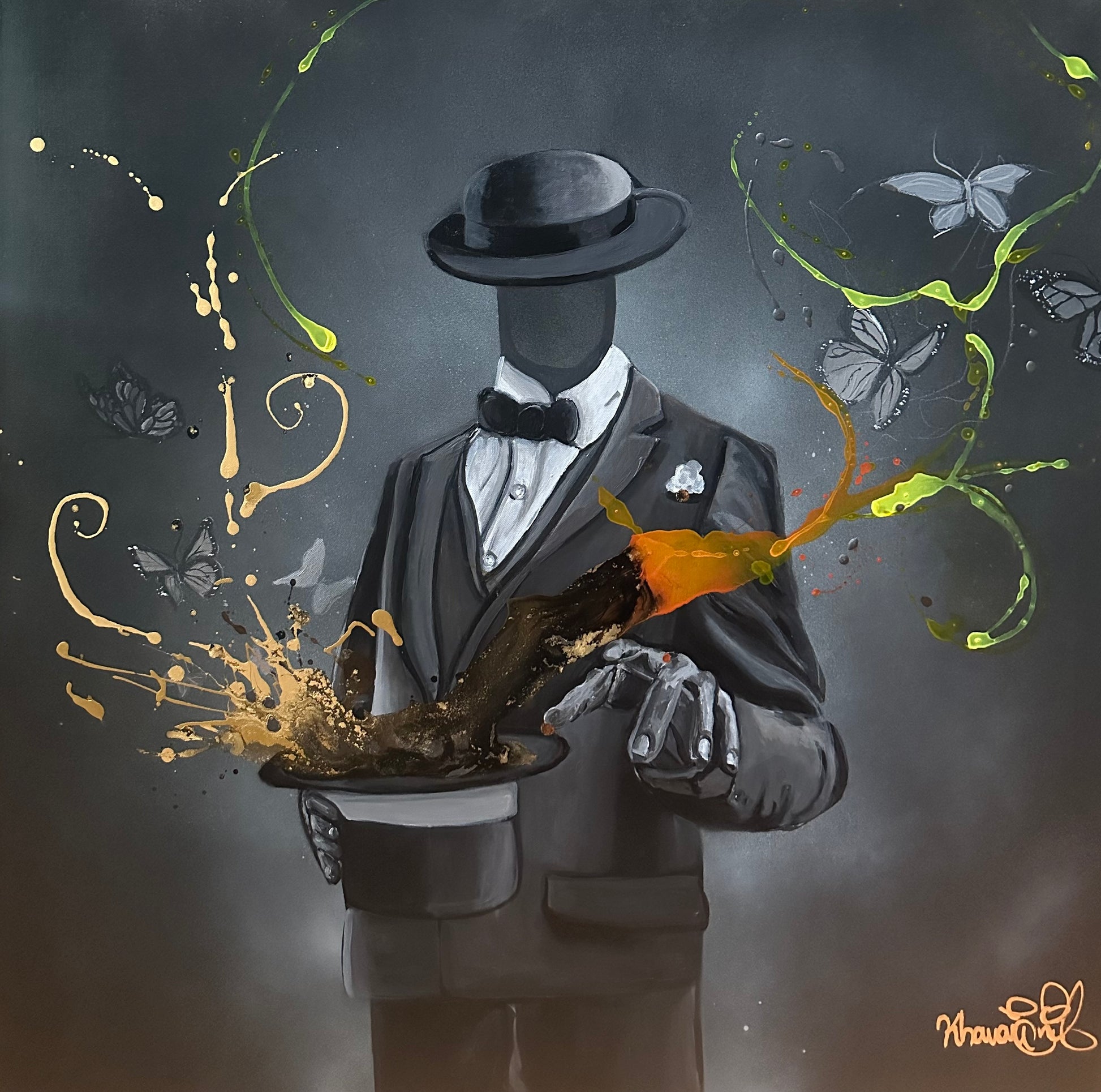 **"Dreamer *** this painting represents the source of magic and inspiration is not tied to a single identity but exists in all of us. Whether we choose to use it or not that’s up to you. The butterflies represent transformation and freedom, emerging as if conjured from the depths of possibility. The gold hues radiate warmth, prosperity, and the untouchable nature of dreams realized. Together, these elements tell a story of transcendence and the boundless potential that lies within us all.